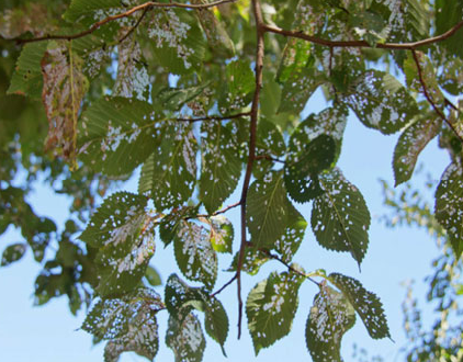 Shot holes on the foliage produced by the Elm Leaf beetle.